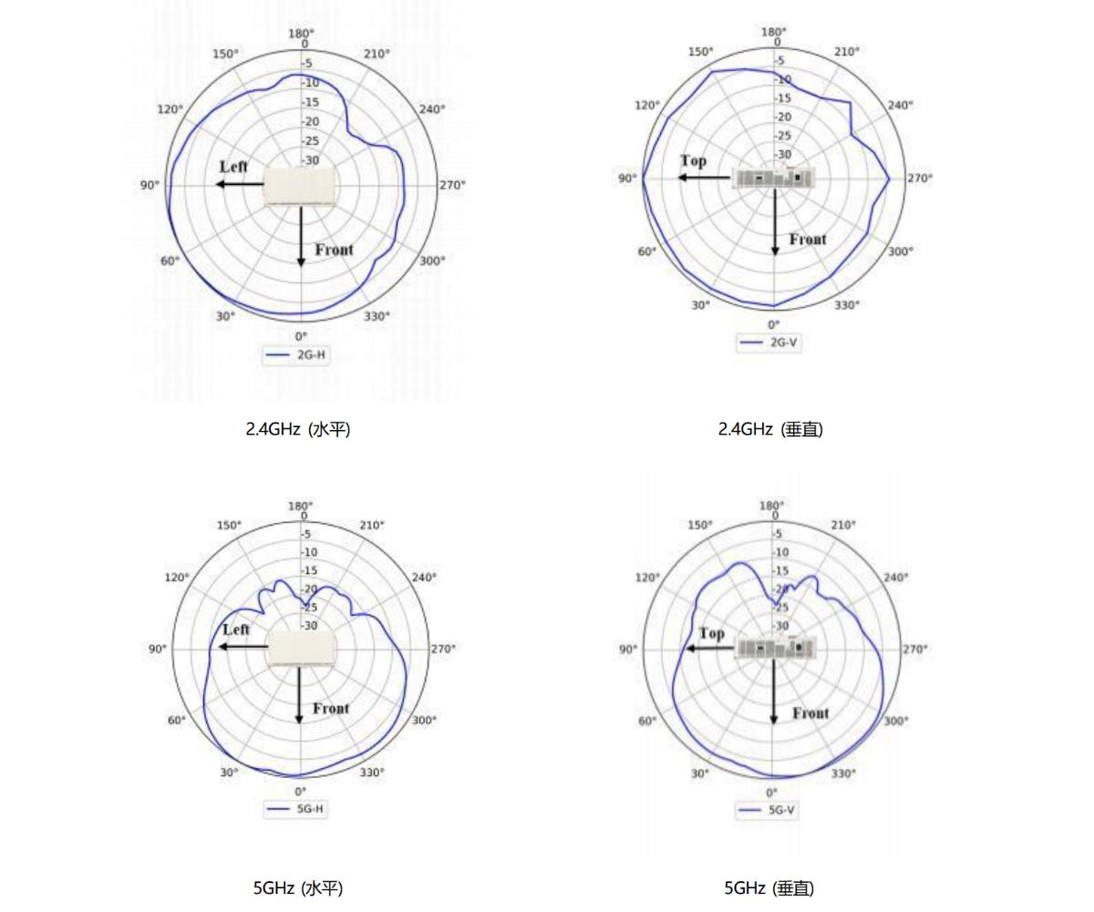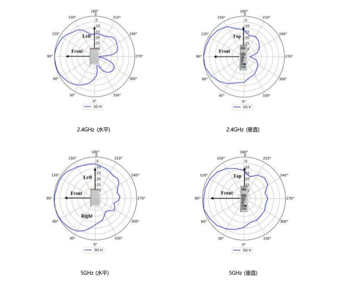 2、组合2.4GHz 或 5GHz 所有天线后,等效天线增益 :2.4GHz: 2dBi, 5GHz:3dBi。